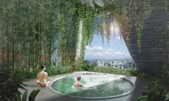 內(nèi)部構(gòu)造上,大自然的主題在架空層內(nèi)部繼續(xù)延伸,架空層中庭擺滿棕櫚樹(shù)和亞熱帶珍稀植物,樓梯和連廊通道同樣被綠植穿插覆蓋,森林餐廳、綠色農(nóng)場(chǎng)、露臺(tái)、咖啡館、書(shū)吧和天際泳池被包圍在粗壯的樹(shù)叢之中,很好地給城市居民創(chuàng)造了一種天空城市公園生活的范本。