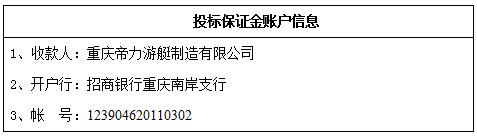 5、本次采購(gòu)根據(jù)《重慶帝力游艇制造有限公司招投標(biāo)管理辦法》采用單一采購(gòu)方式進(jìn)行開(kāi)標(biāo)、唱標(biāo)、評(píng)標(biāo)、談判、定標(biāo)。