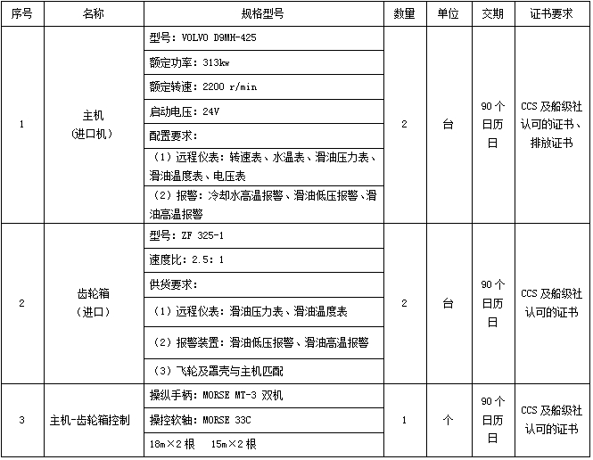 本項(xiàng)目適用于重慶帝力游艇制造有限公司:南部縣地方海事處33米應(yīng)急救援艇機(jī)電設(shè)備采購(gòu)機(jī)械設(shè)備采購(gòu)部分,該項(xiàng)已具備招標(biāo)條件,先對(duì)該項(xiàng)目進(jìn)行單一來(lái)源采購(gòu)招標(biāo)。