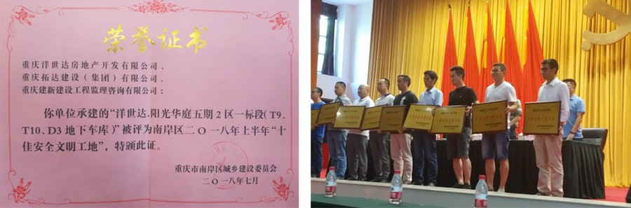 2018年7月17日,經(jīng)南岸區(qū)建委嚴(yán)格評選,洋世達(dá)·南濱特區(qū)(陽光華庭五期)二區(qū)一標(biāo)段項目(T9、T10、D3地下車庫)榮獲南岸區(qū)2018年度上半年“十佳安全文明工地”的榮譽(yù)稱號。