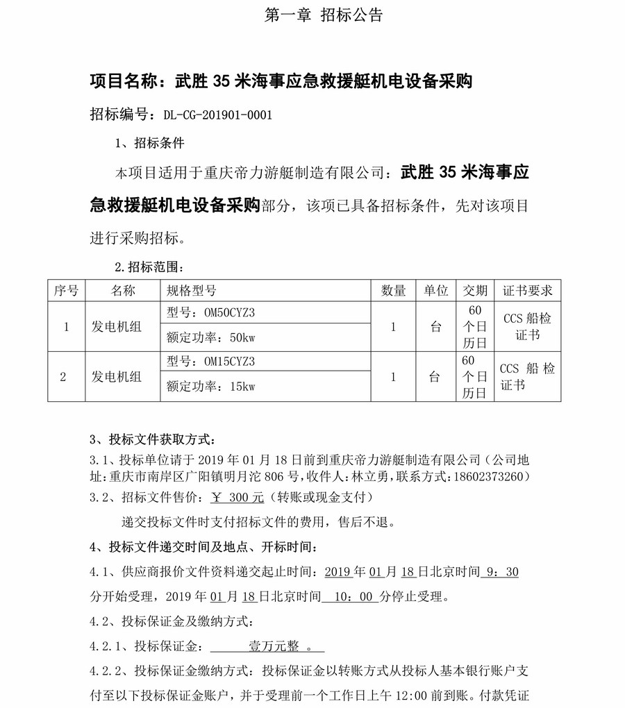 武勝35米海事應(yīng)急救援艇機(jī)電設(shè)備采購
