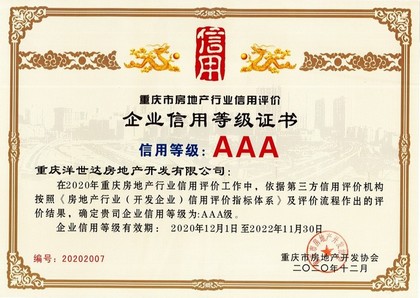 重慶洋世達房地產(chǎn)開發(fā)有限公司榮獲“重慶市房地產(chǎn)開發(fā)協(xié)會2020年度優(yōu)秀會員單位”稱號和重慶市房地產(chǎn)行業(yè)信用評價信用等級AAA級證書。