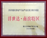 ? 2020年10月,洋世達·南濱特區(qū)項目被重慶市房地產(chǎn)開發(fā)協(xié)會評為“2020重慶房地產(chǎn)行業(yè)產(chǎn)品兌現(xiàn)力推介樓盤”